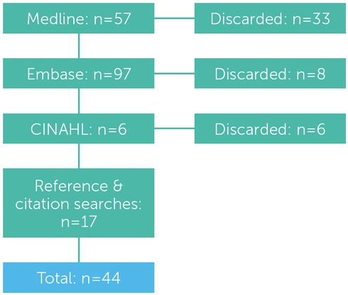 A review of published literature was undertaken in February 2016, using the Medline, Embase and CINAHL healthcare databases. The following search terms were used in combination: ‘tranexamic acid’, ‘cyclocapron’, antifibrinolyt*’, ‘dental surgery’, ‘dentoalveolar’, ‘dental extraction’, ‘molar’, ‘haemophilia’, ‘hemophilia’, ‘Willebrand’, ‘bleeding disorder’. A summary of the literature search strategy is shown in figure 1.