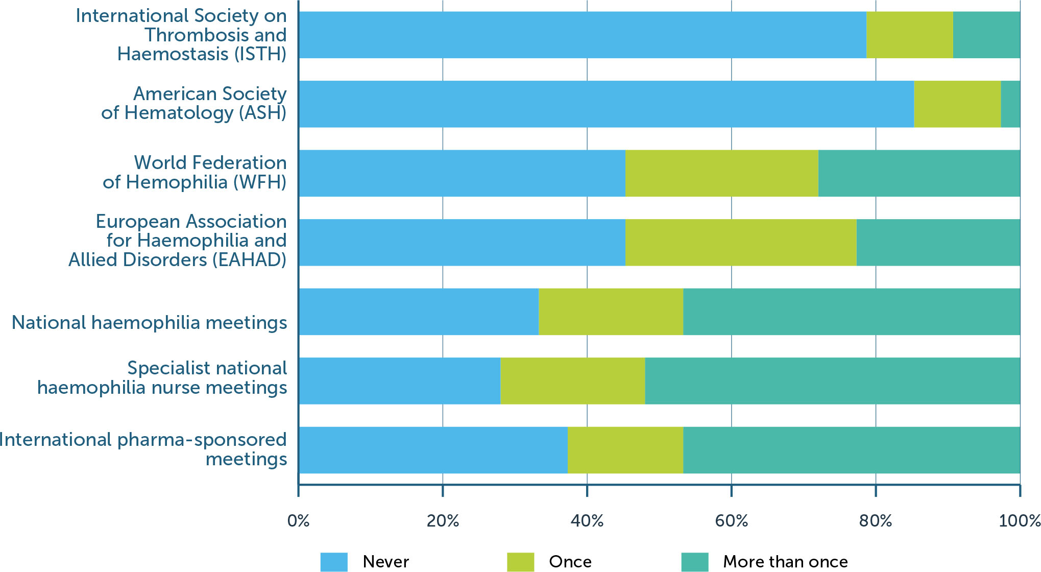 Respondents were asked about attendance at professional meetings, either open events organised by professional organisations or healthcare companies, or locally at their treatment centre (Figure 3). At least half of respondents attended most meetings at least once, the exceptions being the American Society of Hematology Annual Meeting and the International Society on Thrombosis and Haemostasis Congress. The meetings attended more than once by most respondents were meetings for specialist haemophilia nurses (53%), international meetings sponsored by pharmaceutical companies (47%), and national haemophilia society meetings (47%).