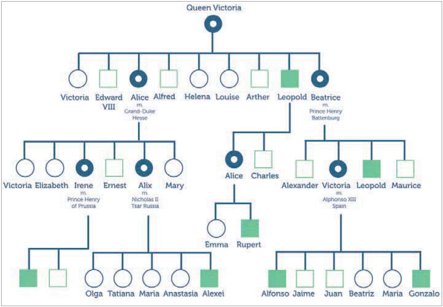 Queen Victoria had four sons (squares) and five daughters (circles). One son had haemophilia B (solid square) and two daughters were known to carry the gene (dotted circle), passing it on to boys in the Spanish and Russian royal families. If she had only had two children, Victoria’s carrier status would have remained unknown