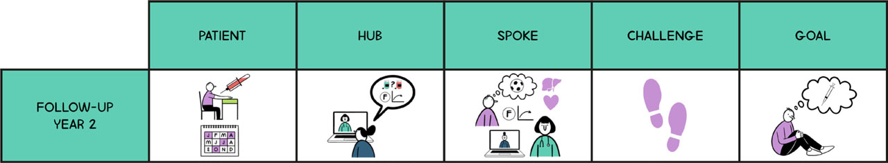 By Year 2, the intensity of follow-up visits to the treatment centre should reduce to between two and four per year, if all is going as it should (Figure 8). For the most part, monitoring will be undertaken by the spoke in liaison with the hub – the hub will continue to link with the spoke with regard to the monitoring of factor levels (blood tests) and liver health tests. For the majority of PwH needing additional medication, this will have stopped, although continuation may be indicated for a small number. Given the burden of immunosuppressive medications, the patient's right to decide whether or not to continue must be acknowledged. In such cases, it is important that the individual understands the risk of losing factor expression.