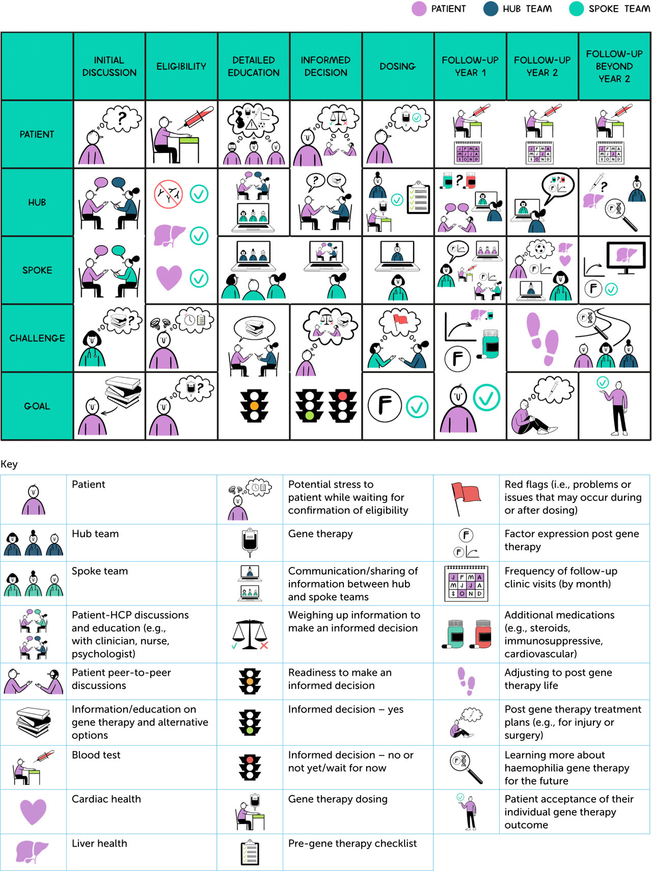 A visualisation of this kind has potential for use in explaining the gene therapy clinical pathway to PwH and could provide a useful tool for HCPs in spoke centres. It is a complex journey and there is a need for materials that enable information to be presented in an accessible way – for both PwH and HCPS – and in a way that can facilitate discussion, not only in terms of initial discussions and education, but throughout the various stages.
