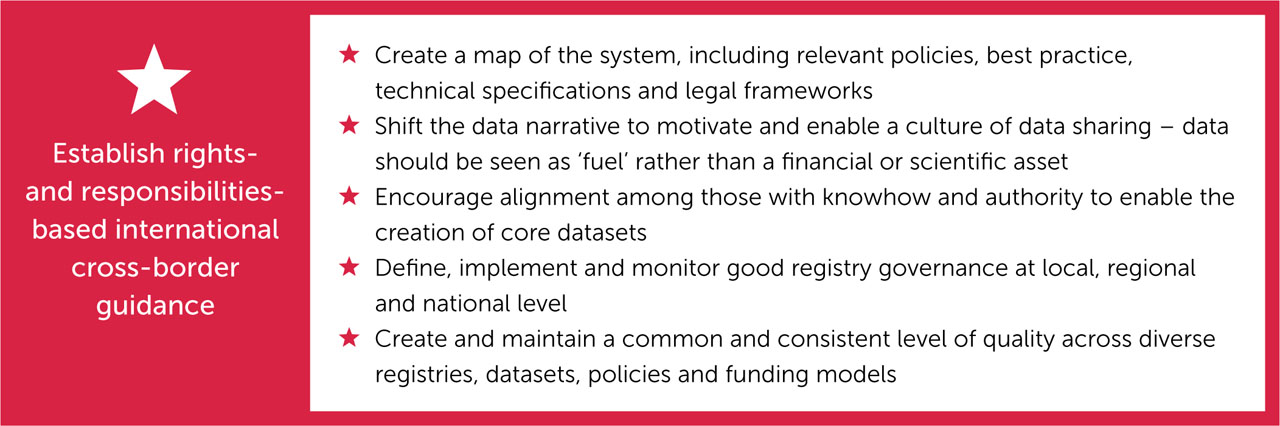 The Workstream on Registries recommended establishing rights- and responsibility-based international cross-border guidance. This could help ensure accountability from all stakeholders contributing, collecting and handling as well as using registry data.