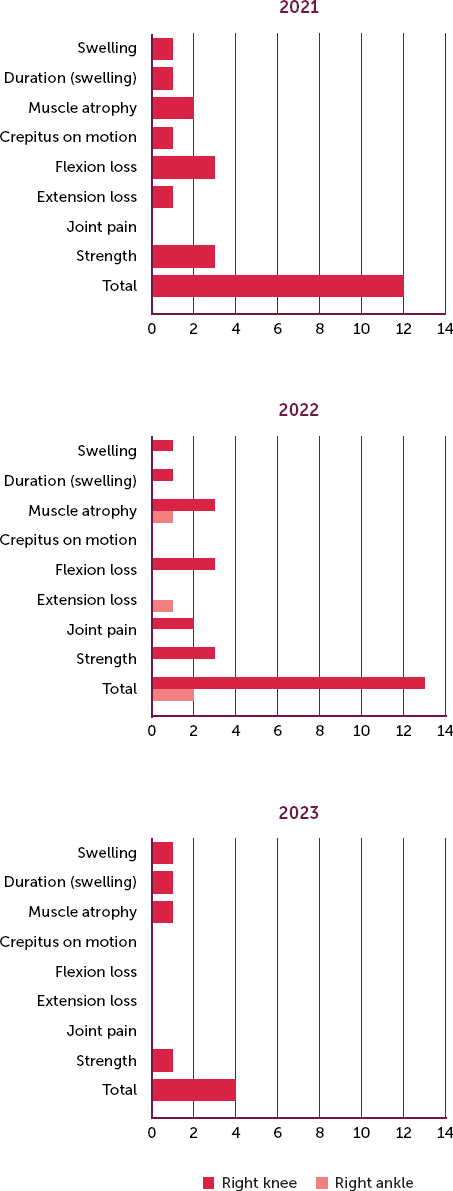The patient was followed up on an outpatient basis two weeks after surgery, then regularly for eight weeks. During this time, he reported no acute bleeding in the affected limb or from the incision site. Haemophilia Joint Health Scores (HJHS) from the presurgical to post-surgical period are shown in Figures 3 and 4. The patient continued to receive emicizumab prophylaxis every four weeks to facilitate healing. For the first four weeks, a loading dosage of 2.4 mg/kg was delivered once a week via subcutaneous injection; from the fifth week onwards a maintenance dose of 6 mg/kg was administered every four weeks. The four-weekly prophylactic regimen takes into account the cost and long process of availing emicizumab; the patient attends the hospital as an outpatient to receive his prophylaxis. It is currently planned that he will receive life-long emicizumab prophylaxis due to the presence of high-titre inhibitor, inability to initiate ITI (due to its a high cost and time-intensive nature), and history of frequent bleeds and hospitalisations.