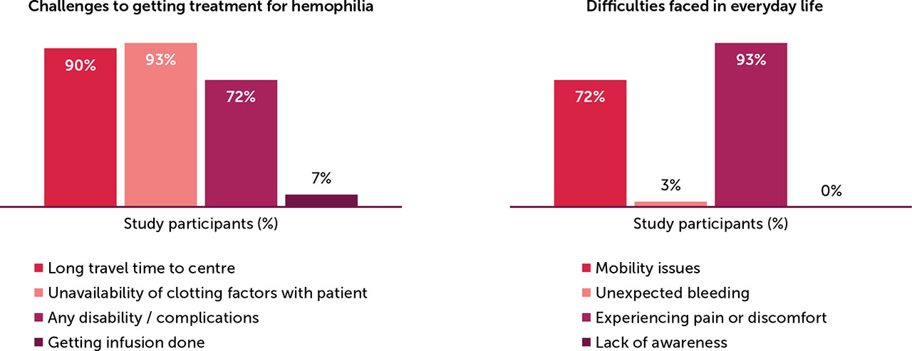 The baseline survey identified barriers encountered by participants in accessing haemophilia treatment, and the key difficulties faced in their daily lives at the time of enrolment in the home therapy training program (Figure 2).