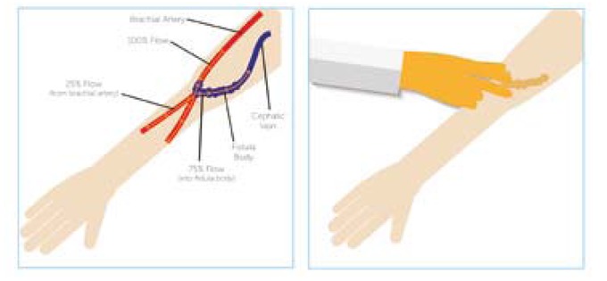 AVF is an anastomosis that redirects arterial blood flow into a vein. In time, it becomes dilated due to the new haemodynamic conditions. Over a period of 6-12 weeks the lumen of the vein widens, thus enabling the venous blood flow to increase [10]. The vein then becomes suitable for puncture and the use of prophylaxis or other alternative treatment can begin. In haemophilia the brachial artery (Figure 1) is preferred for use, as research suggests that the radial artery (Figure 2) is related to a higher rate of failure [6]. AVF is the recommended vascular access for haemodialysis patients; however, it is now becoming an increasingly viable alternative form of access, for the use of prophylaxis in haemophilia and other related bleeding disorders [8,9,14].